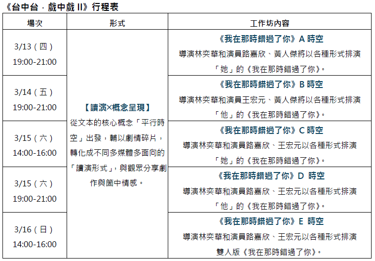 這齣「戲中戲」將在「台中台」二度進行創作,舞台在工作坊中,就如廚房之於廚師和食客, 創作過程中意念如何誕生則遠比成果來的重要 。有興趣來參與的都是「同學」,歡迎大家前來與一位導演和三位演員,一同踏上3月13日至3月16日四天的旅程。