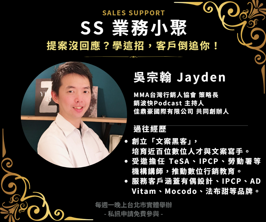 本次講座邀請到 MMA台灣行銷人協會 策略長、銷波快Podcast 主持人、佳鼎豪國際有限公司 共同創辦人——吳宗翰 Jayden,他將分享如何透過精準策略,提升業務提案的成交率,讓客戶不再已讀不回,而是主動找上門!