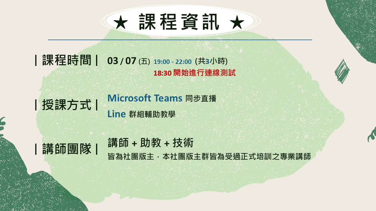 本活動使用Microsoft Teams直播,報名後票券內有Line社群連結務必加入避免漏訊