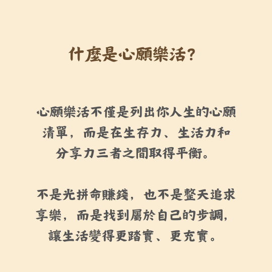 心願樂活不僅是列出你人生的心願清單,而是生存力x生活力x分享力三者之間取得平衡。找到屬於自己的步調,讓生活變得更踏實、更充實。
