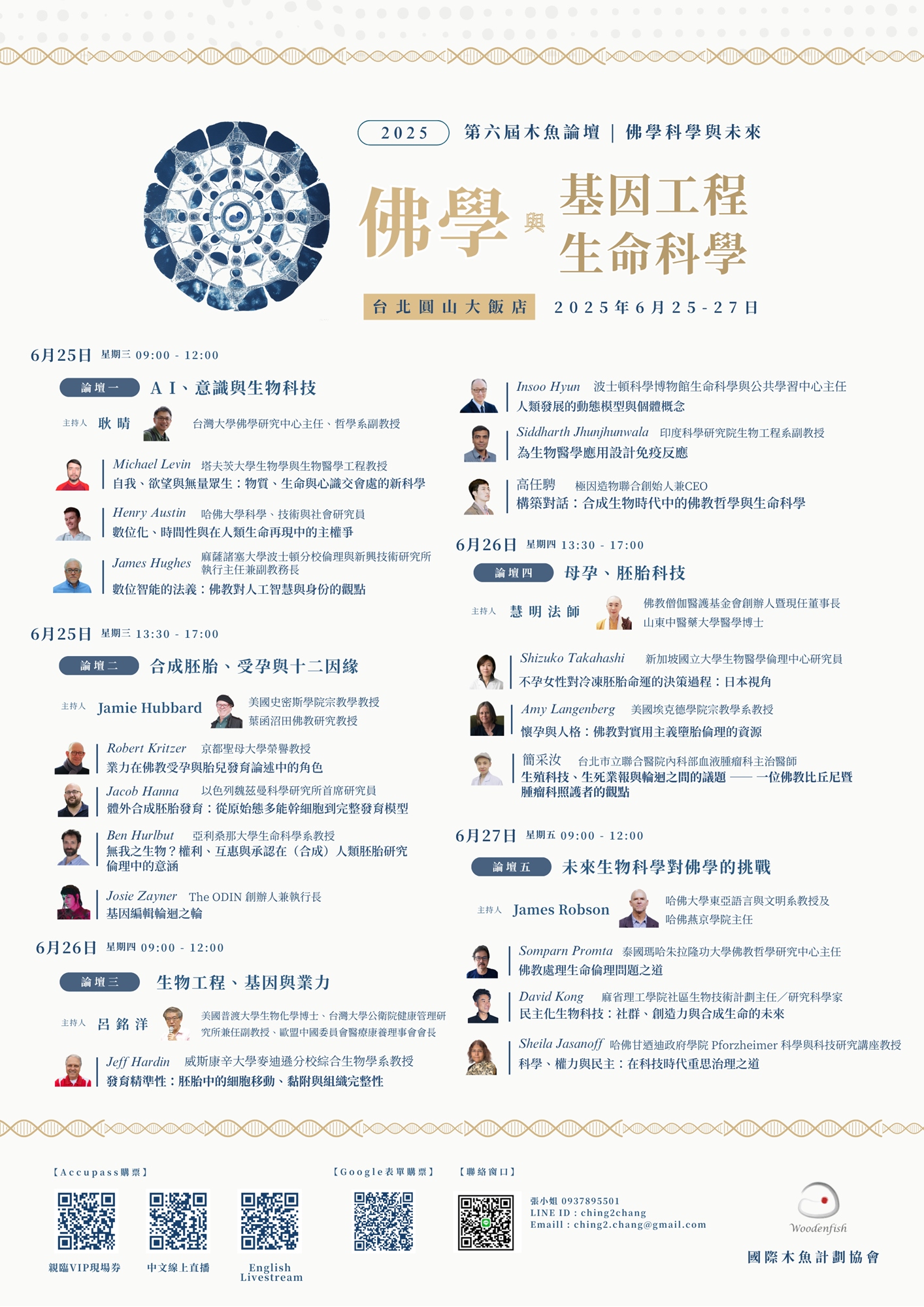 本小組討論旨在探討生物工程領域的其他最新發展(如動物與人類的基因改造、基因治療以及幹細胞改造)對佛教業力與輪回觀念的影響,以及佛教思想如何反過來對這些技術的發展提供倫理啓示。