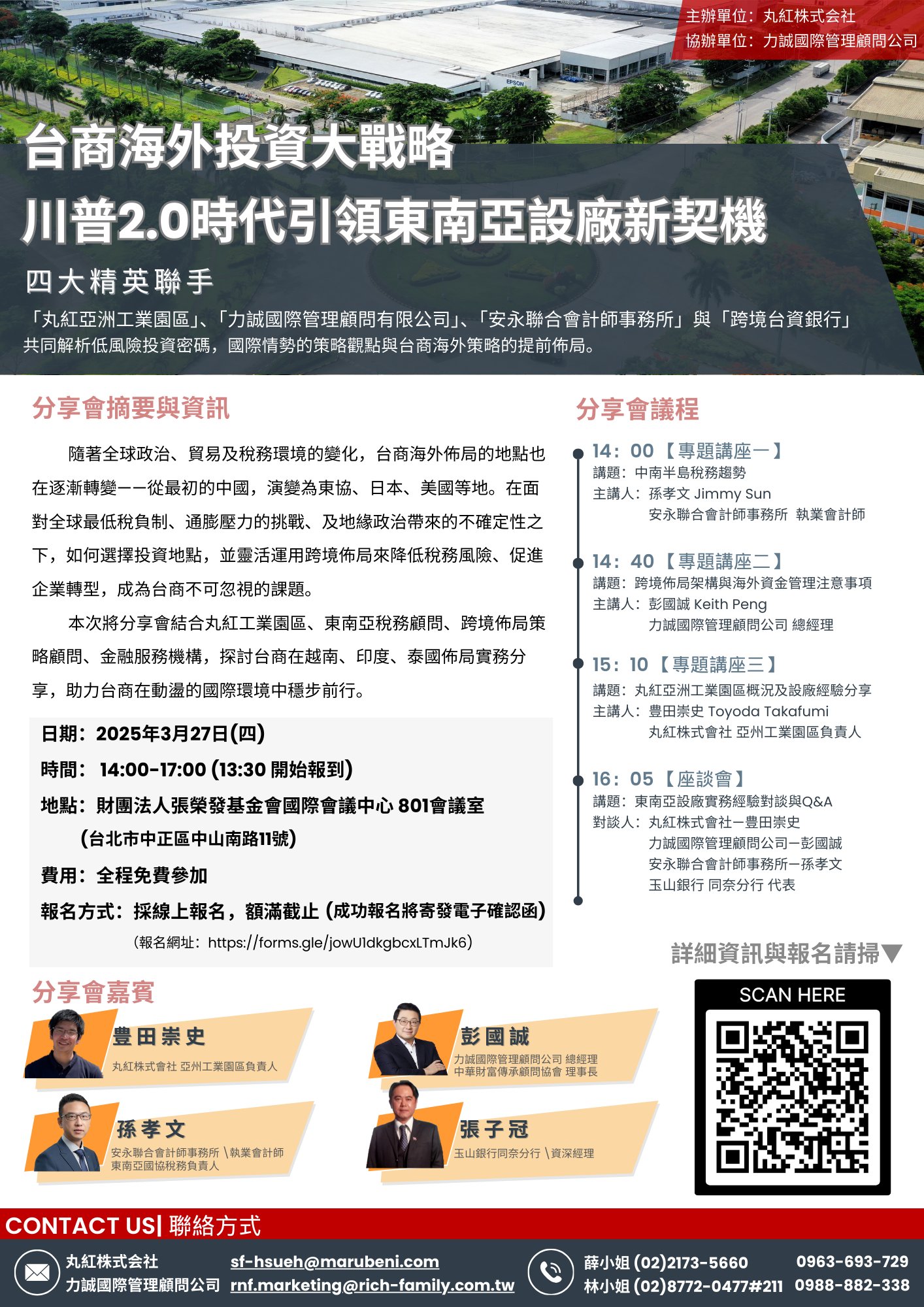 本次將分享會結合丸紅工業園區、東南亞稅務顧問、跨境佈局策略顧問、金融服務機構,探討台商在越南、印度、泰國佈局實務分享,助力台商在動盪的國際環境中穩步前行。