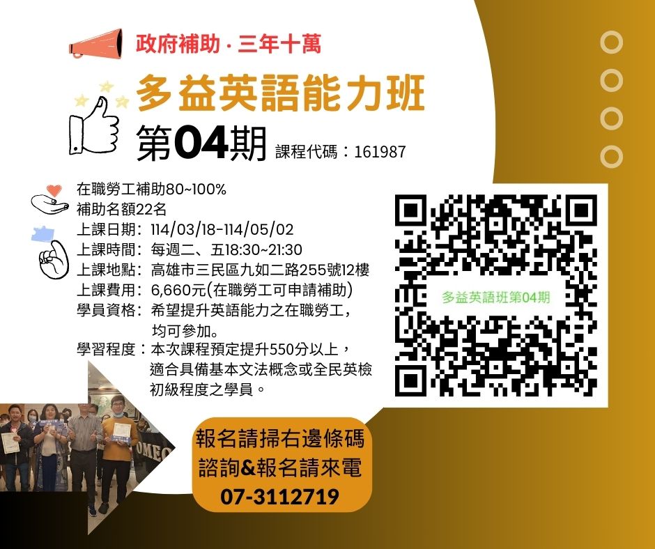 報名網址:https://ojt.wda.gov.tw/ClassSearch/Detail?OCID=161987&plantype=1&fbclid=IwZXh0bgNhZW0CMTAAAR2L48X230Avkuf7ULVcFCo-3nPGWhIpx9YfGf8ZbwF_97b7g_KjuLr0sQ0_aem_kos19An5w960q2c4QOqMfQ