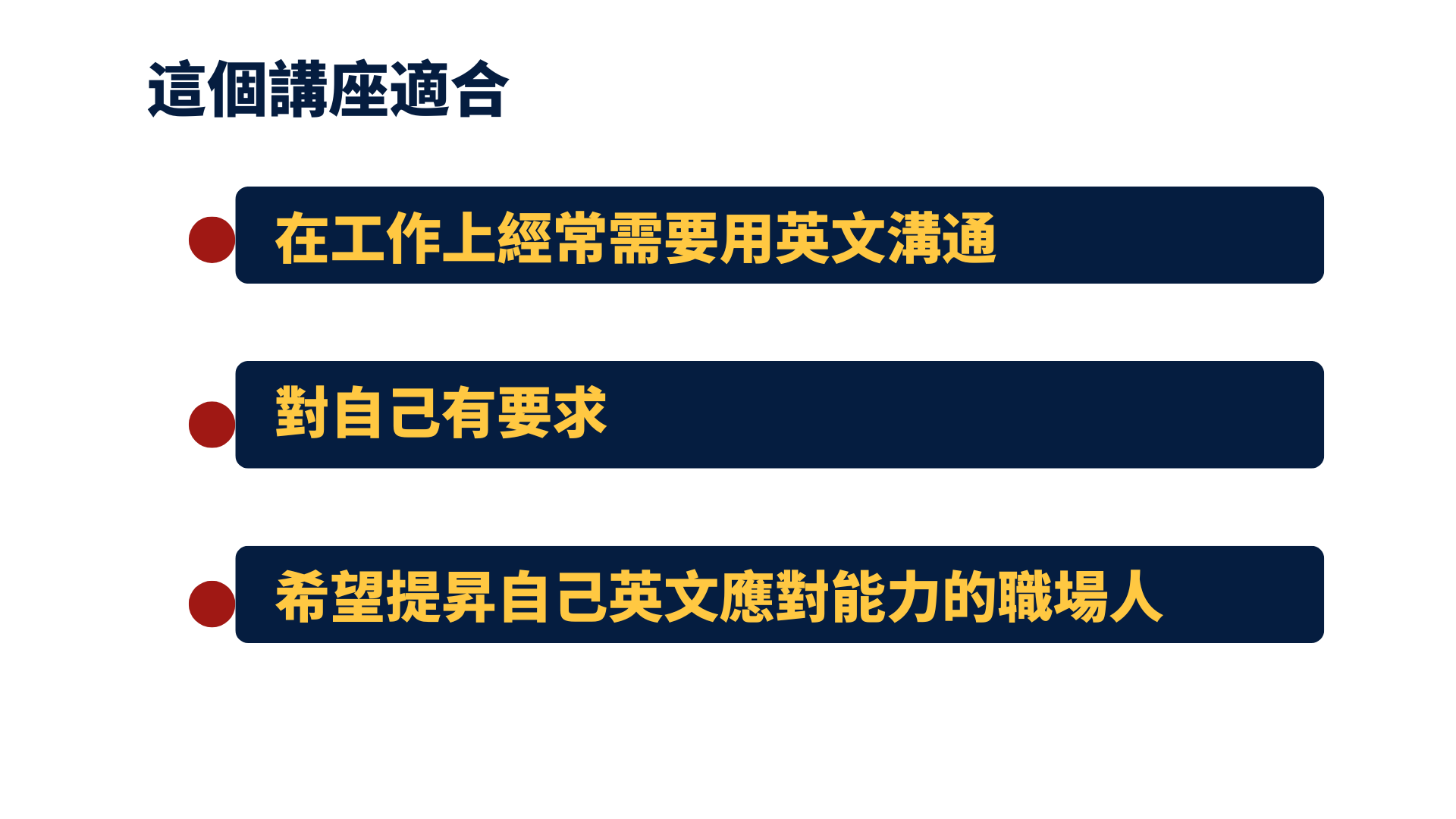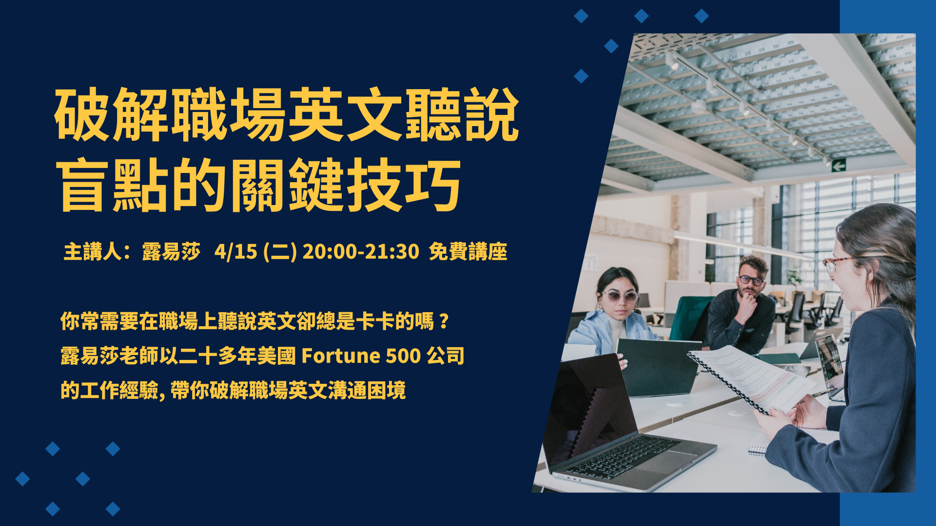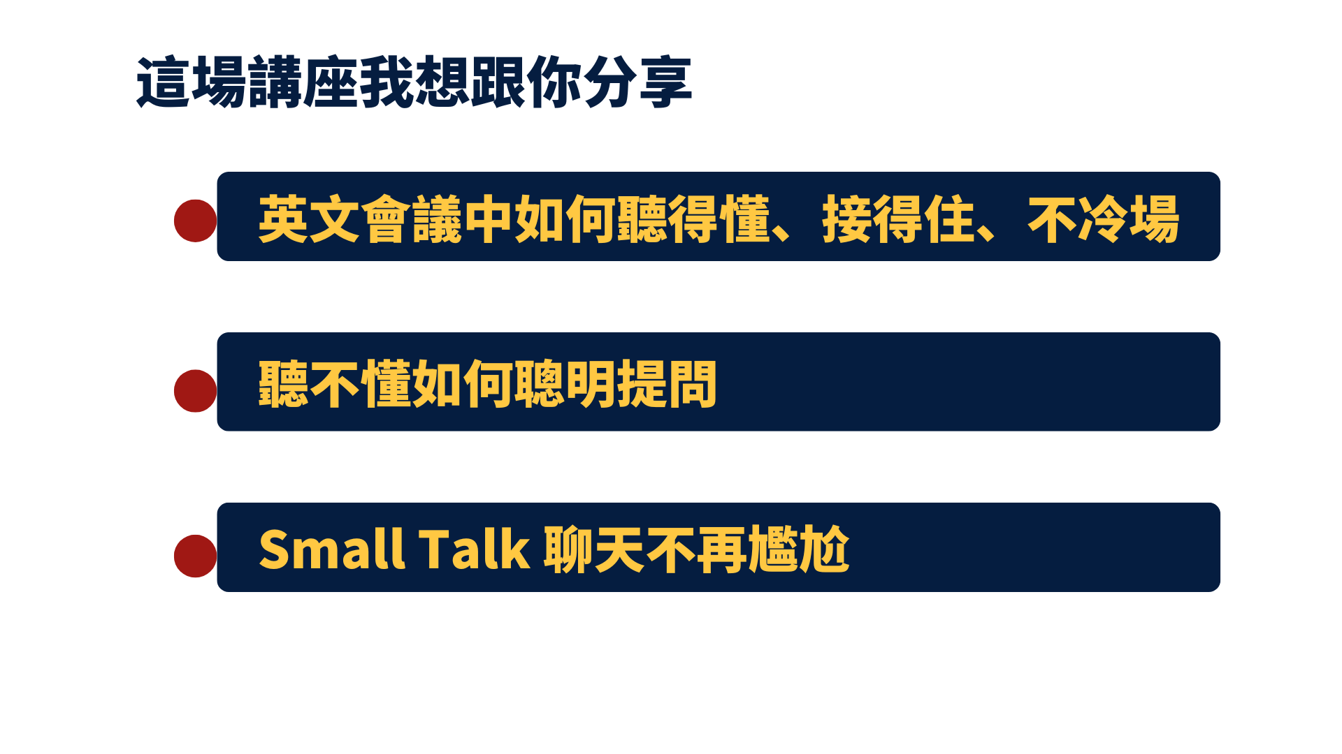 這場職場英文免費講座將以非母語者的視角, 提供幾個實用的溝通技巧, 幫助你克服語言障礙、流利表達, 從而應用到真實的工作場景中。和坊間英語教學最大的不同是講師本身有在美商大公司實際的工作經驗,也時常参與國際會議,能了解學員需求,並根據職場經驗提供情境式教學,即時反饋與調整。