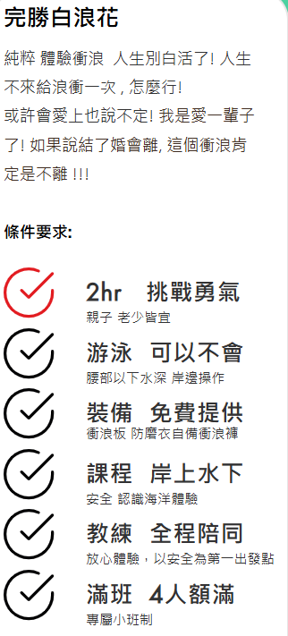 本人自願參加衝浪團練活動,並同意主辦方所指定的各項規定及採取的措施;本人身心健康,適合參加本次活動。衝浪體驗需耗費較多體力,請務必再三審慎評估自身能力;懷孕、膝蓋受傷或體力不佳的旅客不宜參加此活動 此活動不含保險請加購保或自行投保全面理解參加活動可能出現的風險,且已準備必要的防範措施,本人願意承擔活動期間發生的自身意外風險責任。對於非主辦方原因造成的傷害、其他任何形式的損失不索求任何形式的賠償。本人授權主辦方無償使用本人肖像、聲音於主辦方之公開媒體(FB及IG之活動紀錄使用)。本人或法定代理人已認真閱讀並全面理解以上內容,且對上述內容予以確認,並承擔相對應的法律責任。