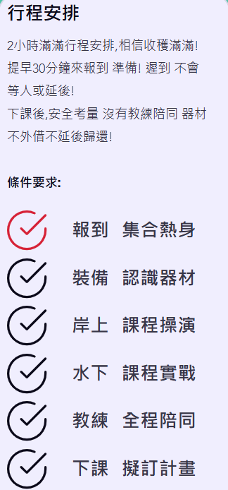 提供衝浪板器材+上身防磨衣(基於安全考量,在沒有教練陪同,下課後需準時歸還,無法延後使用)