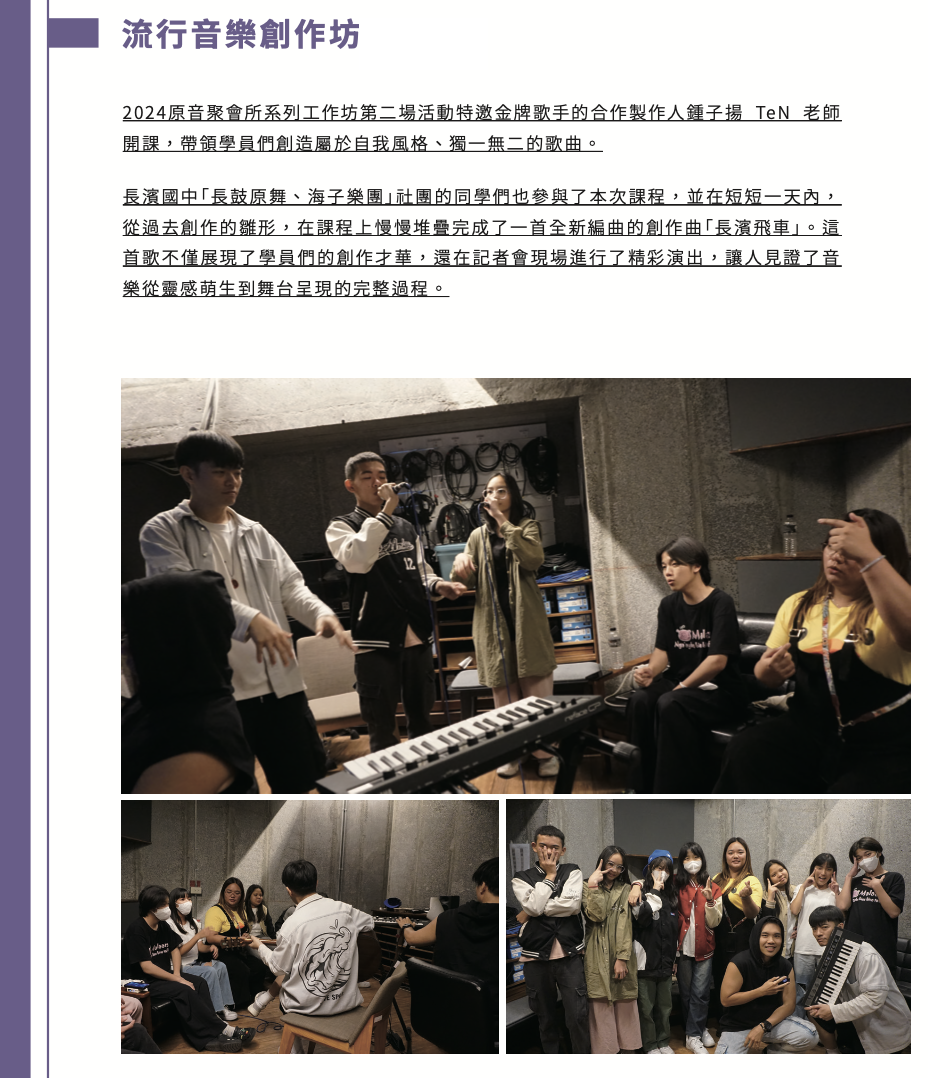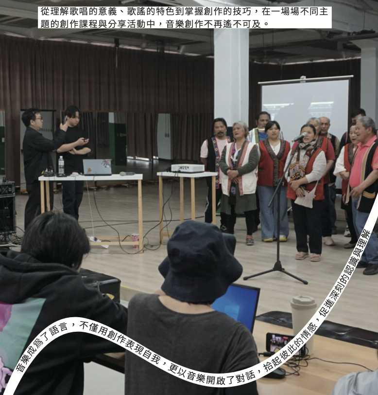 透過來自業內流行音樂的創作過程、靈感發想,帶領學員共同探索屬於自己的音樂風格,學習如何寫詞、譜曲,到編曲、錄音,實際進入錄音室,與夥伴們共同創作專屬於應援精神的流行音樂吧!