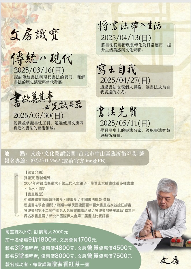✨ 報名3堂課程者,優惠價 4800元,文房會員 4500元