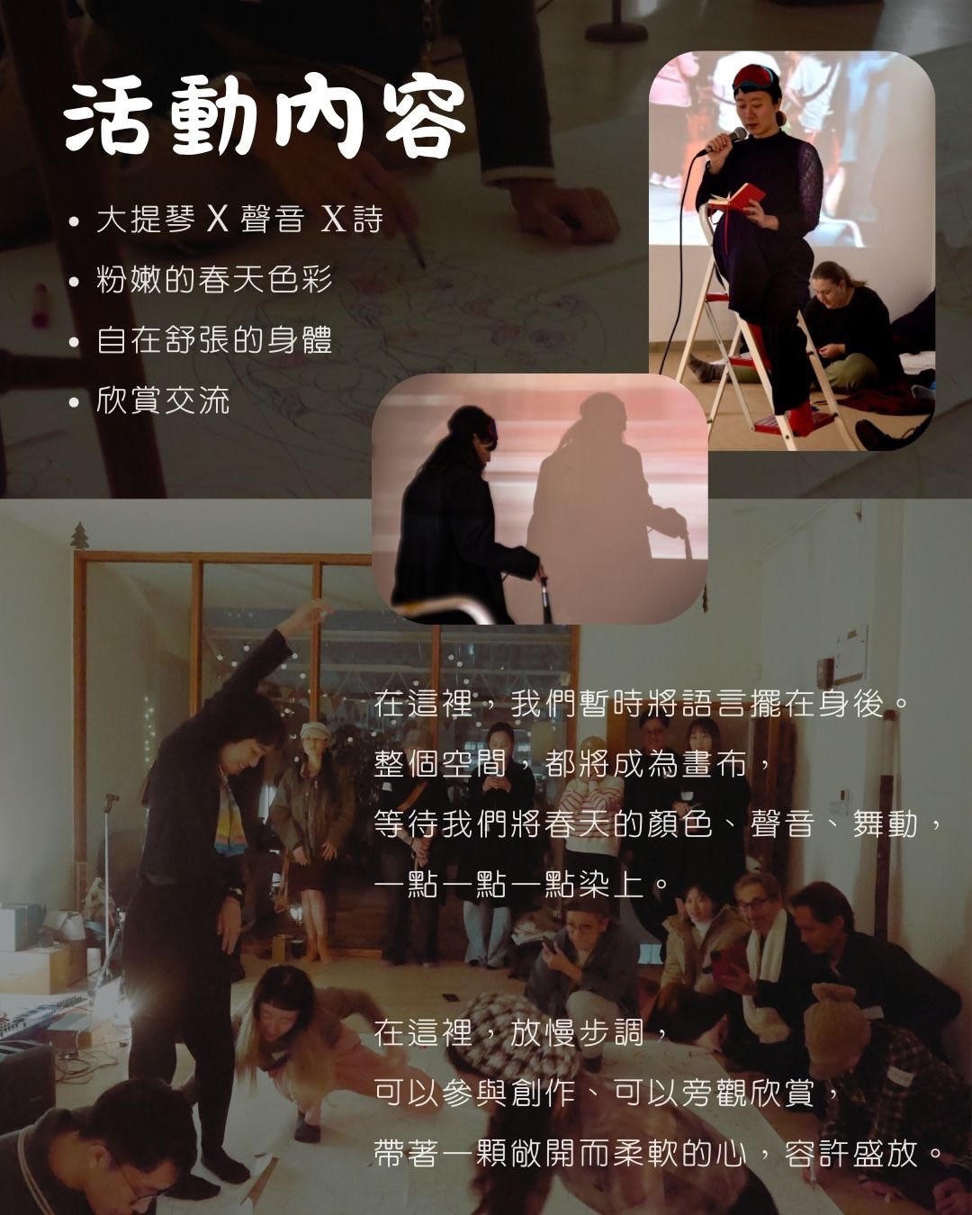 這次的主題是「春日盛開」,我們將用色彩、聲音與身體,讓春天在場域中流動。