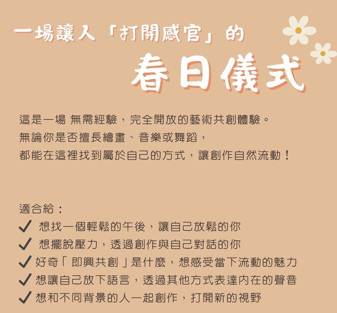 在春風吹拂的午後,讓我們一起創造、交流、連結,共度一期一會的藝術時光。