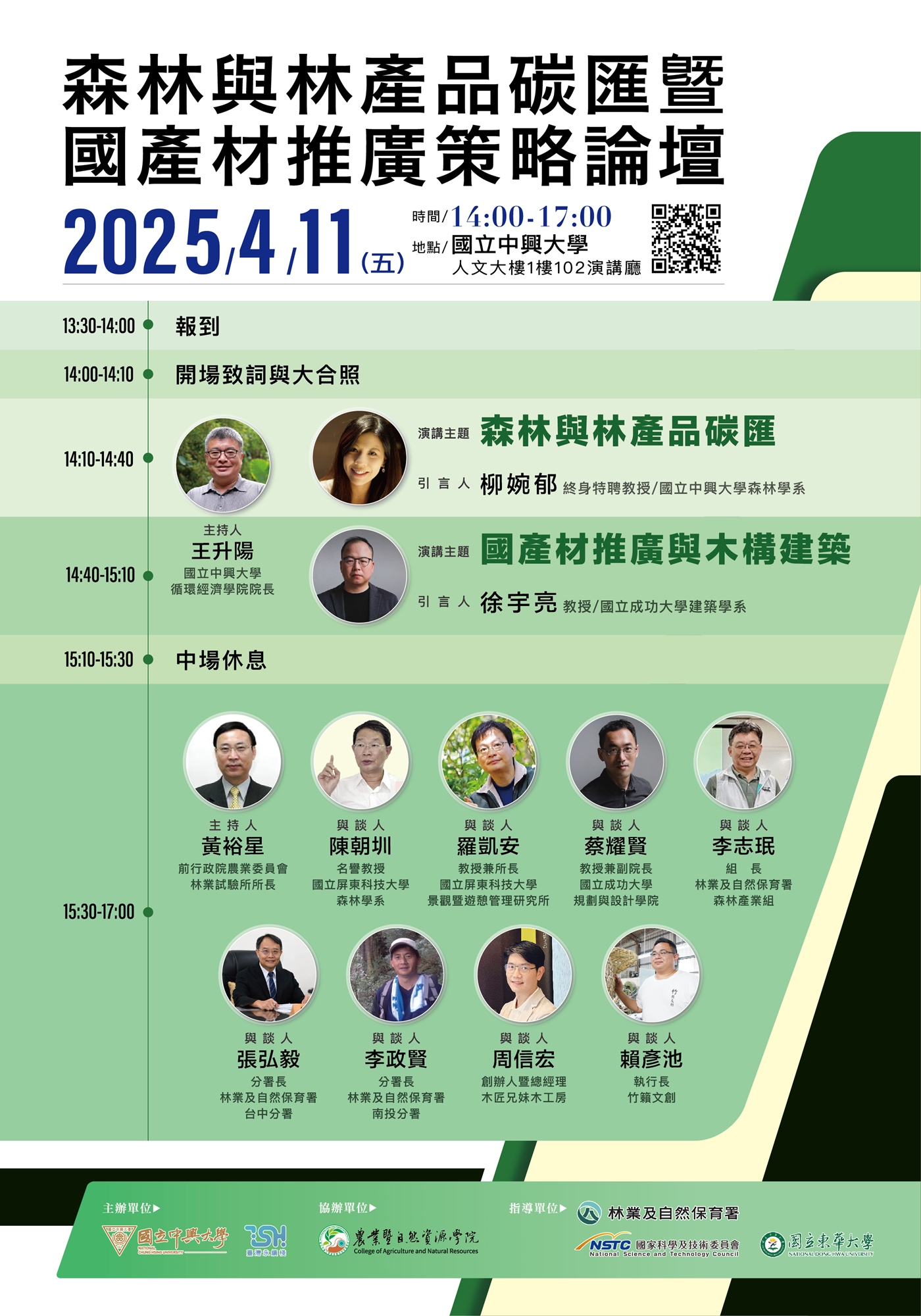 14:10-14:40 (演講25分/ 問答5分) | 演講主題:「森林與林產品碳匯」 引言人:柳婉郁 終身特聘教授 國立中興大學森林學系 | 王升陽 國立中興大學循環經濟學院院長 |