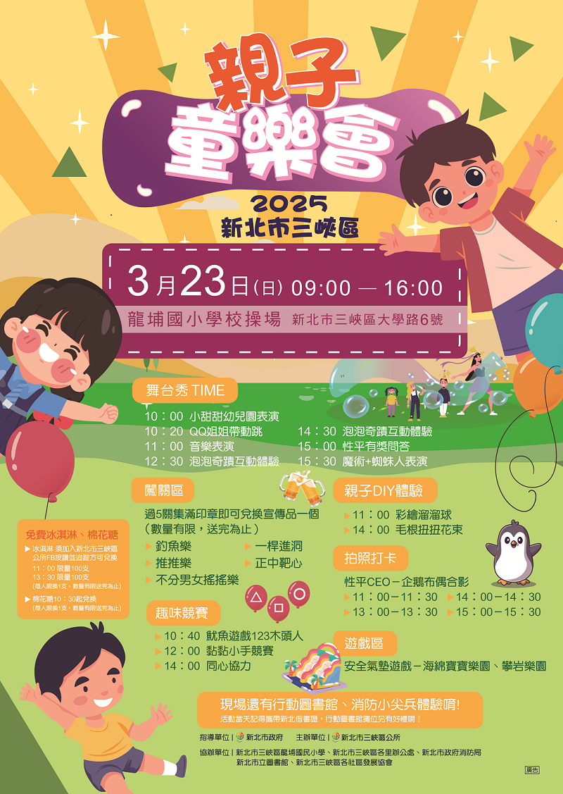 3月23日(星期天)9:00-16:00,2025新北市三峽區親子童樂會就在龍埔國小
