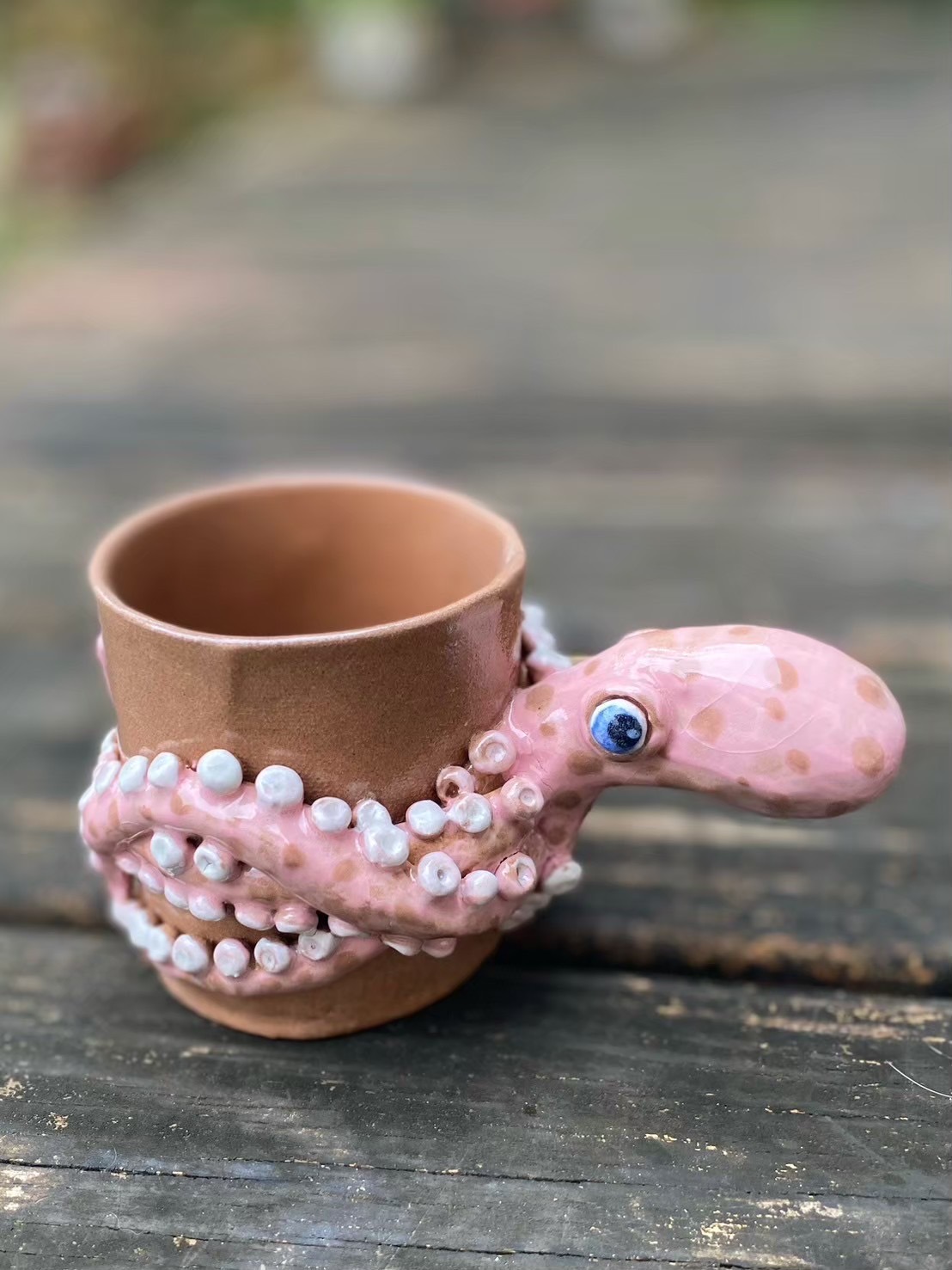 教學內容:準備適當的軟硬土下,我們提供滾壓工具,製作皮帶狀陶板圈圍主體,再桿一片黏底部,我們按部就班的教授章魚腳的做法,並將它拼貼在外做裝飾、最後我們提供化妝土,讓學員們自己上顏色,最後我們帶回乾燥,素燒高溫釉燒,便完成如圖的作品。