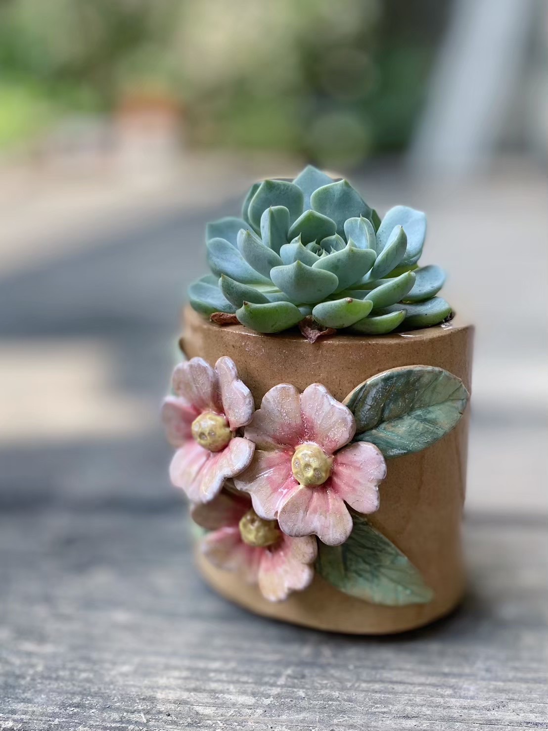教學內容:準備適當的軟硬土下,我們提供滾壓工具,製作皮帶狀陶板圈圍主體,再桿一片黏底部,我們按部就班的教授花與葉的做法,並將它拼貼在外做裝飾、最後我們提供化妝土,讓學員們自己上顏色,最後我們帶回乾燥,素燒高溫釉燒,便完成如圖的作品。