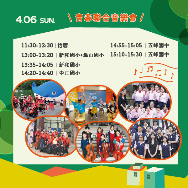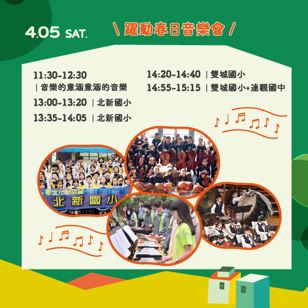 在微風輕拂的春日午後,音符如同花朵般綻放。邀請新店在地國中小的學生樂團登上舞台,讓孩子們用天真的音符,演繹屬於新店春天的樂章。從輕柔的樂器聲到活潑的歌聲,每一段旋律都像春風般輕拂心間,邀請一同駐足傾聽,與孩子們的音符共鳴,感受這份純粹又溫暖的春日旋律。