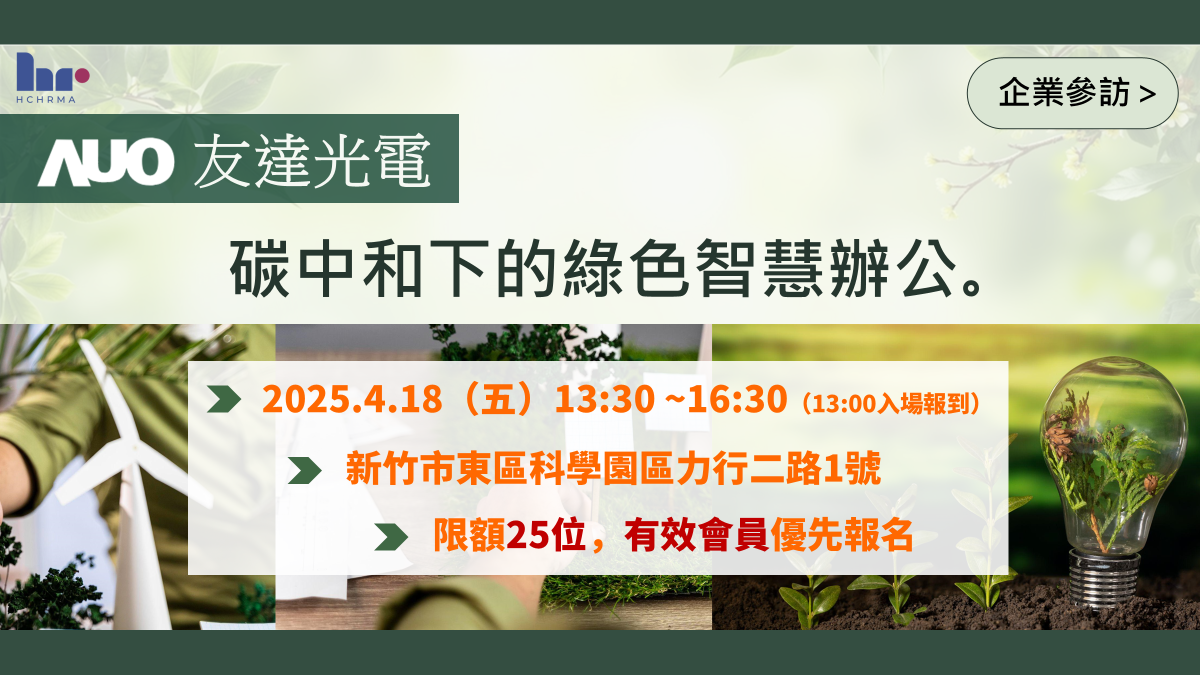 在全球永續趨勢下,企業如何打造低碳、智慧化的工作環境?本次企業參訪,我們將帶領 20位HR夥伴 走進 友達光電,親身見證企業如何實踐 碳中和目標與智慧辦公策略,打造永續且高效的職場!