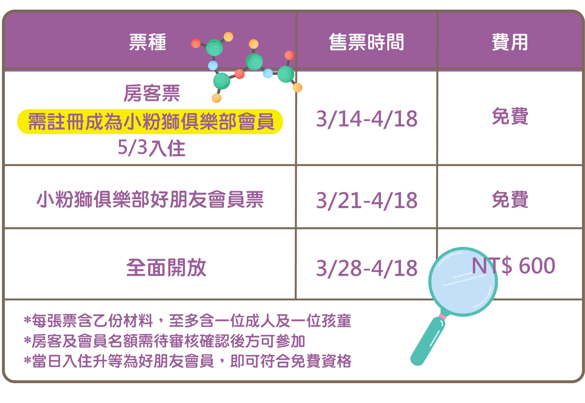 ●注意事項:每房最多兩組免費名額,如超過需另行購買一般票