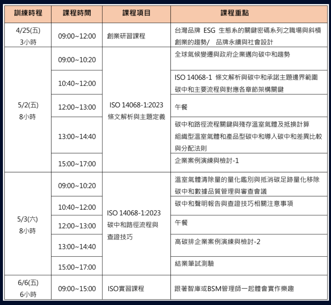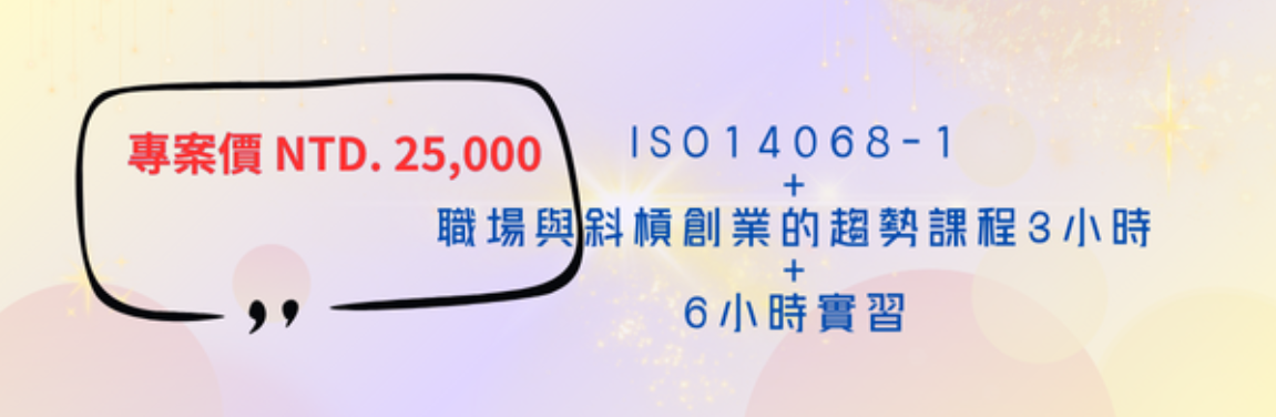 報名【碳中和創業研習班】,獲得ISO 14068-1證照,把握永續發展的趨勢,擁抱職場升遷及創業的雙重機會,邁出成為未來綠色產業領軍人物的第一步!