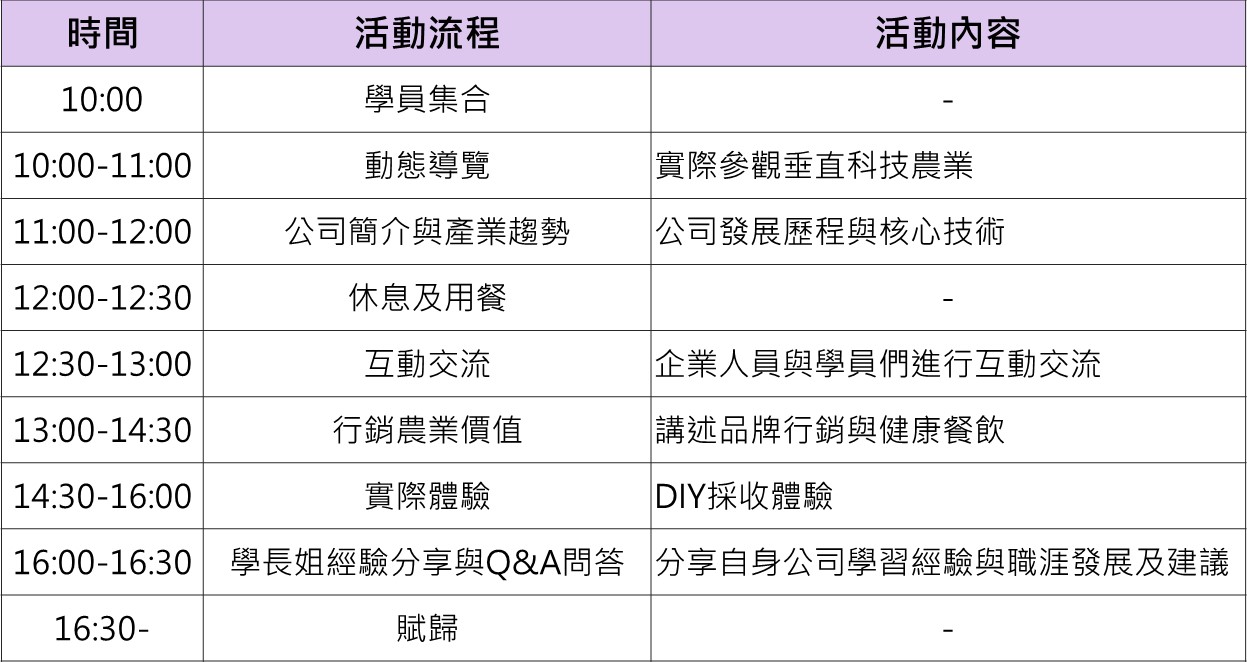 本場活動將由源鮮農業生物科技股份有限公司的學長姐帶領學員導覽源鮮智慧農場,了解行銷農業的價值,並實際體驗作物採收,更進一步認識臺灣農業領域。