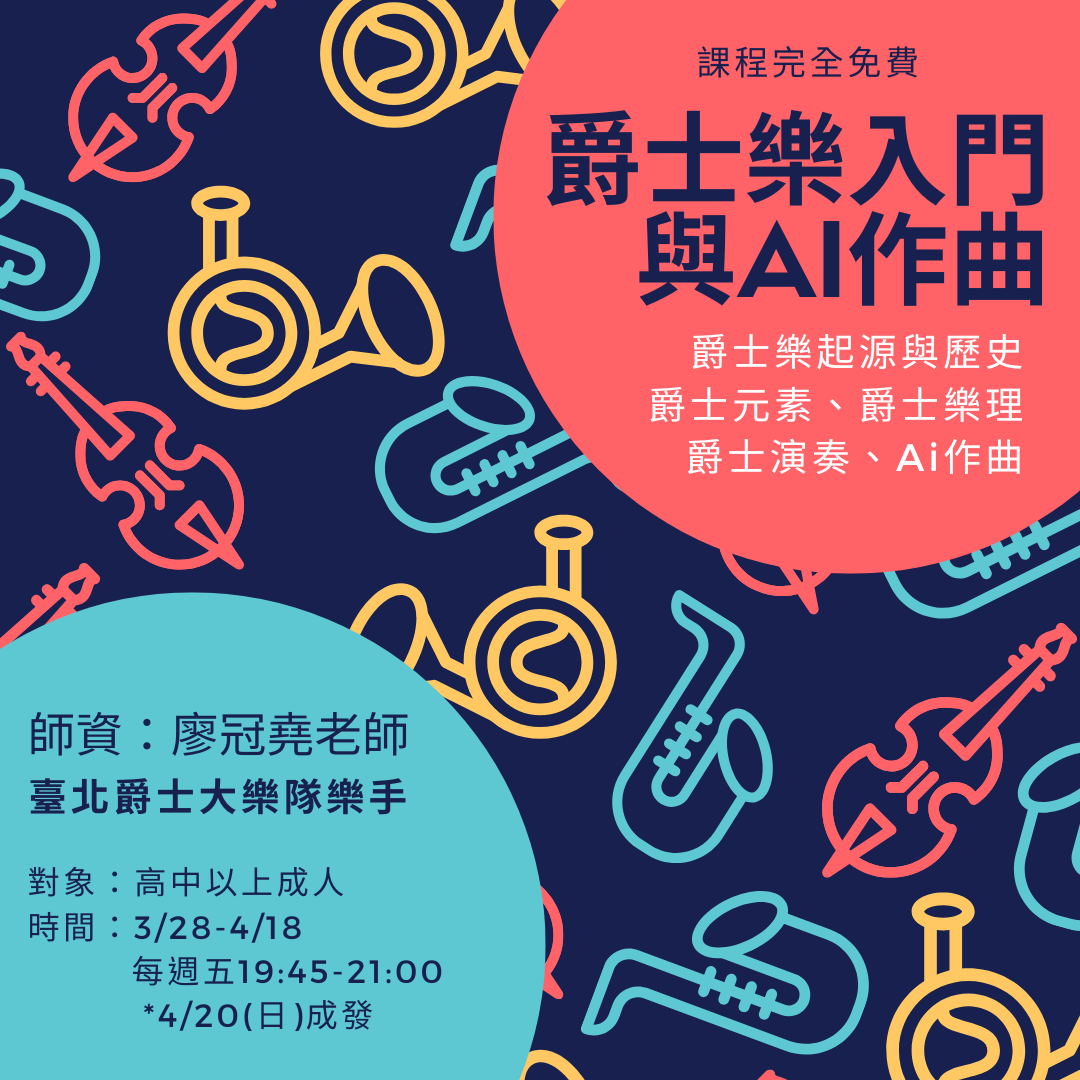 活動內容:爵士樂起源與歷史、爵士元素、爵士樂理、爵士演奏、AI作曲