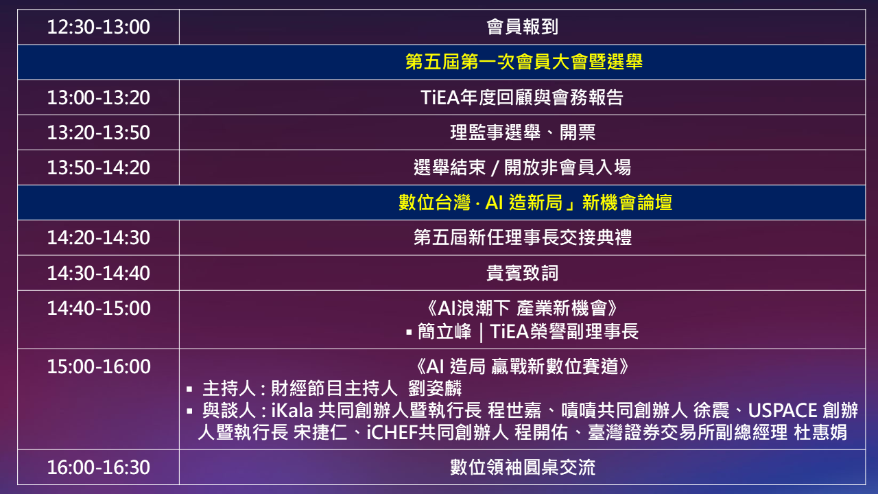 本次大會以「數位台灣 ‧ AI 造新局」為主題,邀請台灣數位創新領域代表展開主題座談對話,現場亦匯聚 300 位數位產業 CEO 及高階經理人,在創新變革路上的數位新創業者共學共享,加速台灣數位經濟成長。此外當日將由大會選舉出第五屆新任理事長與理監事,TiEA 推動台灣 AI 與數位產業發展的重任不中斷,將接續領航往數位經濟強國之路邁進。