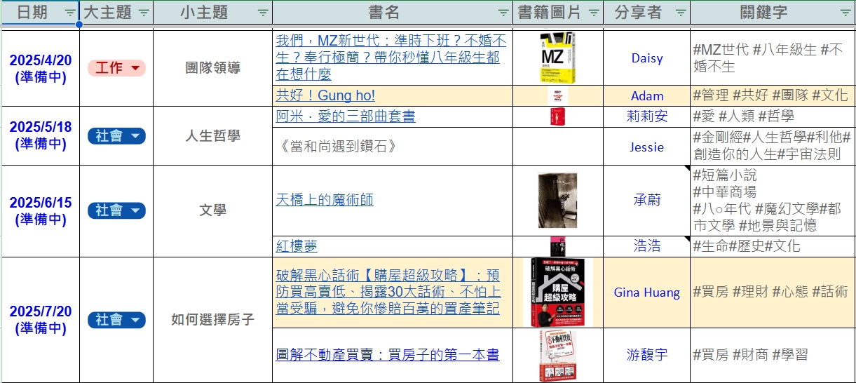 我們是「主題讀書會」,定期由書友們分享不同的主題