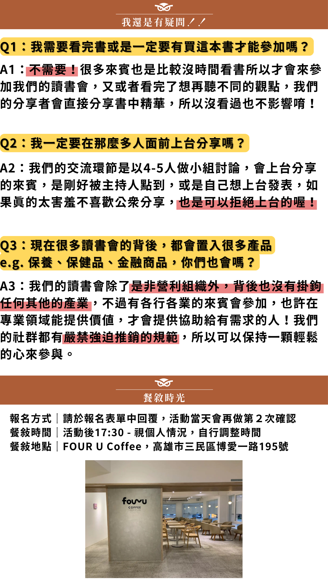 為了確保活動品質,在《讀品交義》讀書會的這個領域,可以大方的宣傳、行銷自己,但嚴禁強迫推銷任何產品,強迫任何他人不願意的合作,騷擾任何一位來賓,如有發生類似事件,本單位將有權永久取消參與活動之權利。
