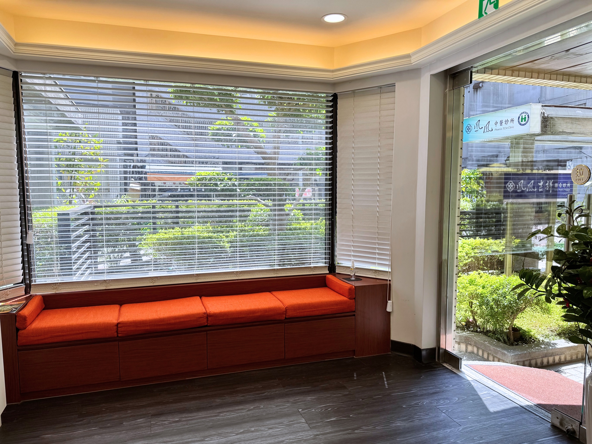 鳳凰中醫診所候診區以木質設計與暖橘色坐墊營造溫馨感,大面窗戶與百葉窗引入自然光,兼顧隱私與舒適。