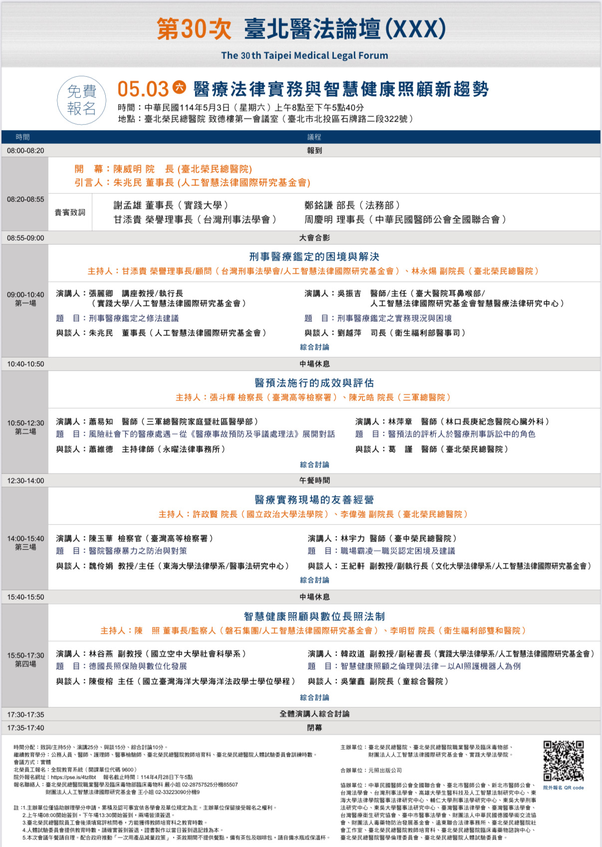 協辦單位:中華民國醫師公會全國聯合會、臺北市醫師公會、新北市醫師公會、台灣法學會、台灣刑事法學會、高雄大學生醫科技及人工智慧法制研究中心、東海大學法律學院醫事法律研究中心、輔仁大學刑事法學研究中心、東吳大學刑事法研究中心、東吳大學醫事法研究中心、臺灣醫事法律學會、臺灣醫事法學會、台灣醫療衛生研究協會、臺中市醫事法學會、財團法人中華民國德國學術交流協會、財團法人毒藥物防治發展基金會、遠東聯合法律事務所、臺北榮民總醫院社會工作室、臺北榮民總醫院教師培育科、臺北榮民總醫院臨床毒藥物諮詢中心、臺北榮民總醫院醫學倫理委員會、臺北榮民總醫院人體試驗委員會。