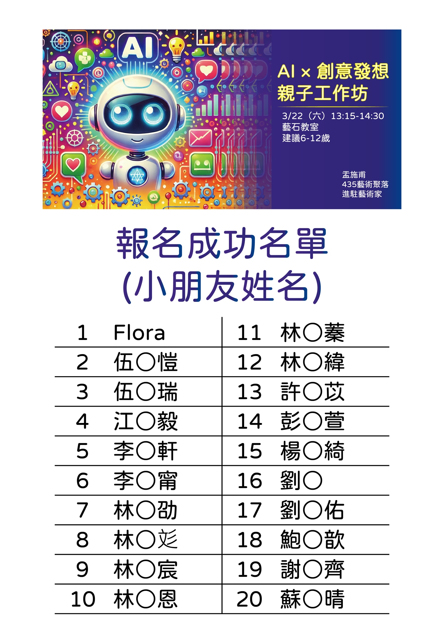 ●報名成功名單將於活動前公告於活動頁面及板橋435藝文特區Facebook粉專相關貼文留言處。