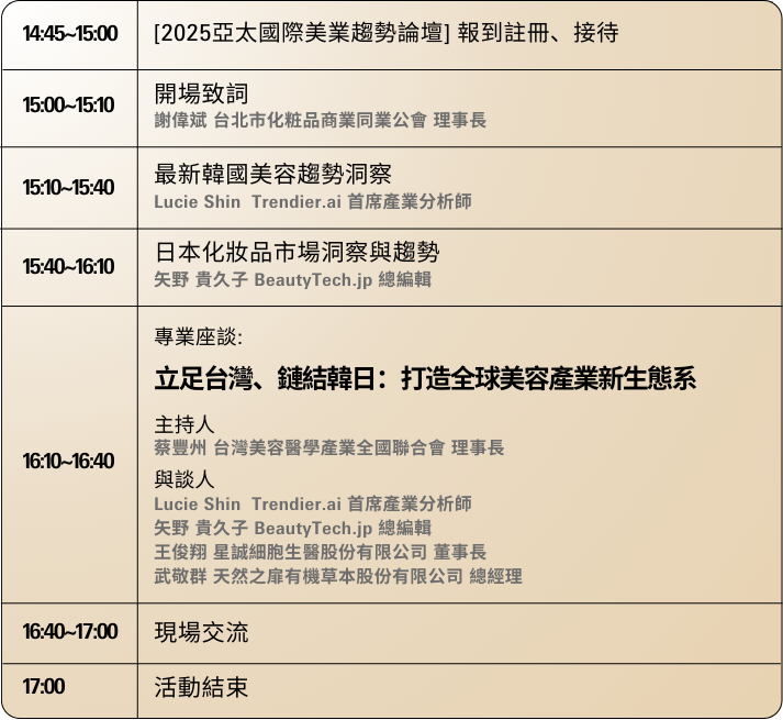 展會期間將舉辦【2025亞太國際美業趨勢論壇】,主題為「立足台灣、鏈結韓日:打造全球美容產業新生態系」,邀請韓、日專家剖析最新趨勢,並由台灣美容醫學產業全國聯合會理事長蔡豐州主持專業座談,探討醫療賦能、創新思維與國際轉型。