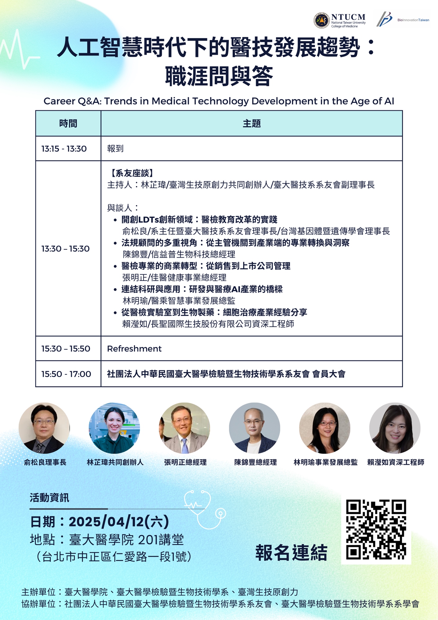 本次座談會邀請到臨床醫學、醫材法規、市場策略、通路行銷等具有醫療產業豐富經驗的專家,以及鏈結產業與學術具有豐富經驗的臺大醫技系專家教授與會討論。在座談會上,將與現場與會人共同對談,探討產業觀察與經驗,帶領醫技人才探索未來職涯。