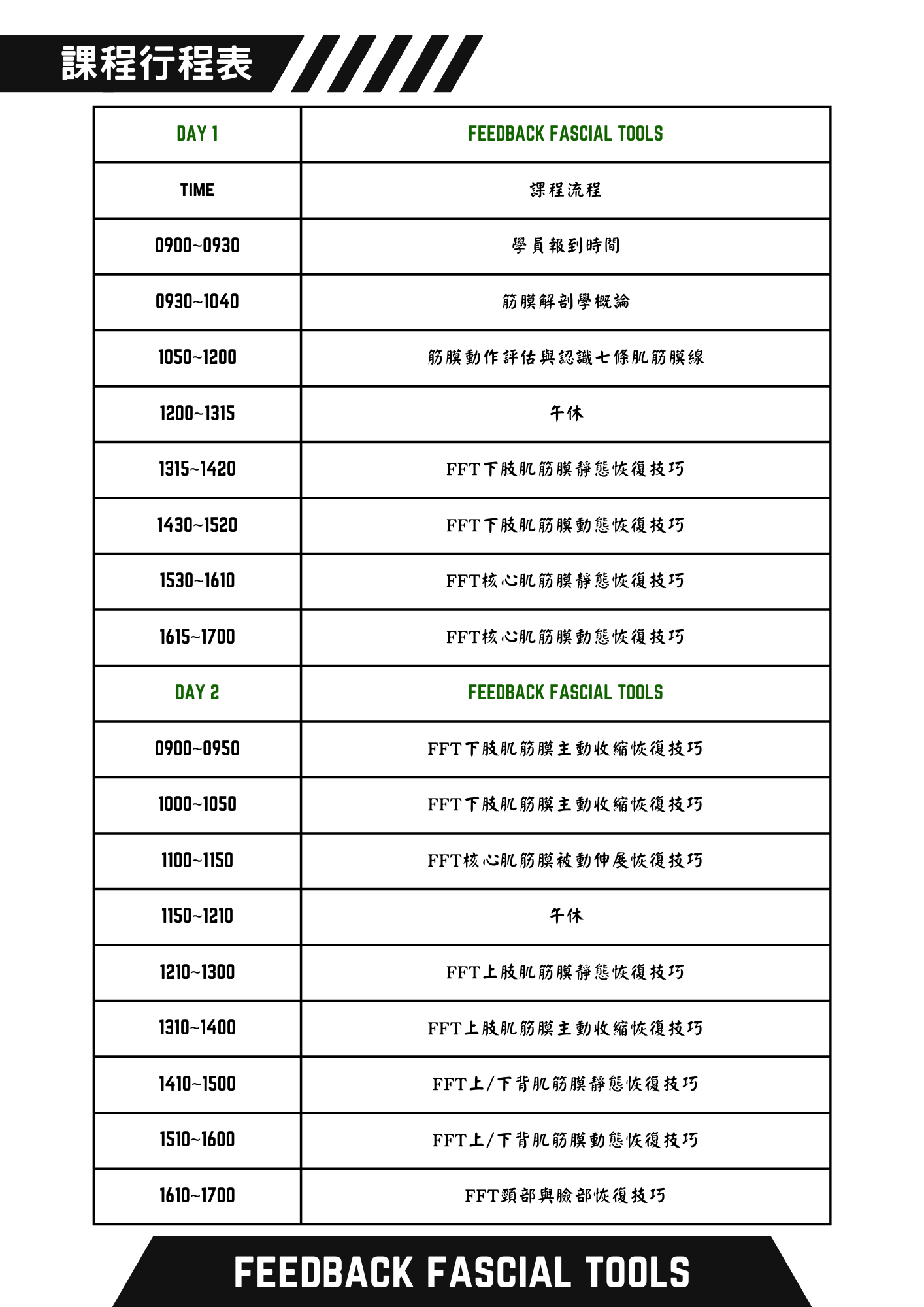 透過科學化的恢復系統訓練,搭配 Feedback Fascial Tools(FFT),學員將學會如何整合各種操作手法、主動動作、肌肉伸展與擺位技術,改善筋膜與軟組織的功能,進一步強化動作品質與預防運動傷害。