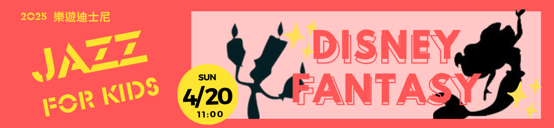 但你知道嗎?這些耳熟能詳的經典歌曲中,有許多都是以爵士曲風進行創作或編曲的喔!本次兒童爵士日,我們將演出並介紹這些藏身在迪士尼動畫中的爵士歌曲,邀請您跟著我們的節奏,一起在迪士尼的魔法世界中輕鬆搖擺!
