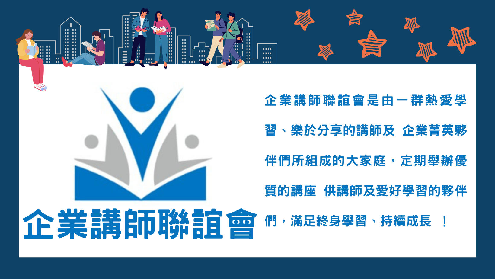 企業講師聯誼會於2001年成立,本會為非營利的社團組織,所有的幹部皆為無酬志工,我們秉持著「熱愛學習、樂於分享」的心態參與其中,多為講師、人資、訓練或喜歡學習的夥伴。希望提供所有知識工作者們一個「知識共學、情感共創、舞台共享」的平台,留下一個美好良善的學習環境,讓更多人透過企業講師聯誼會充電賦能,進而發光發熱!