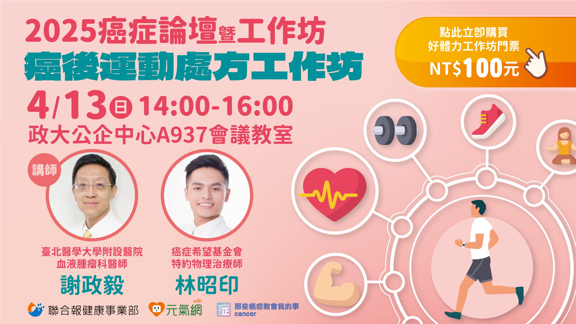 工作坊將透過五大關鍵訓練(肌力、肌耐力、平衡、敏捷、心肺),幫助癌友安全、有效地重拾健康自信,並透過個人化的運動處方,應對人工血管、骨鬆風險等癌後常見問題,讓每一位癌友都能找到最適合自己的癌後運動處方。