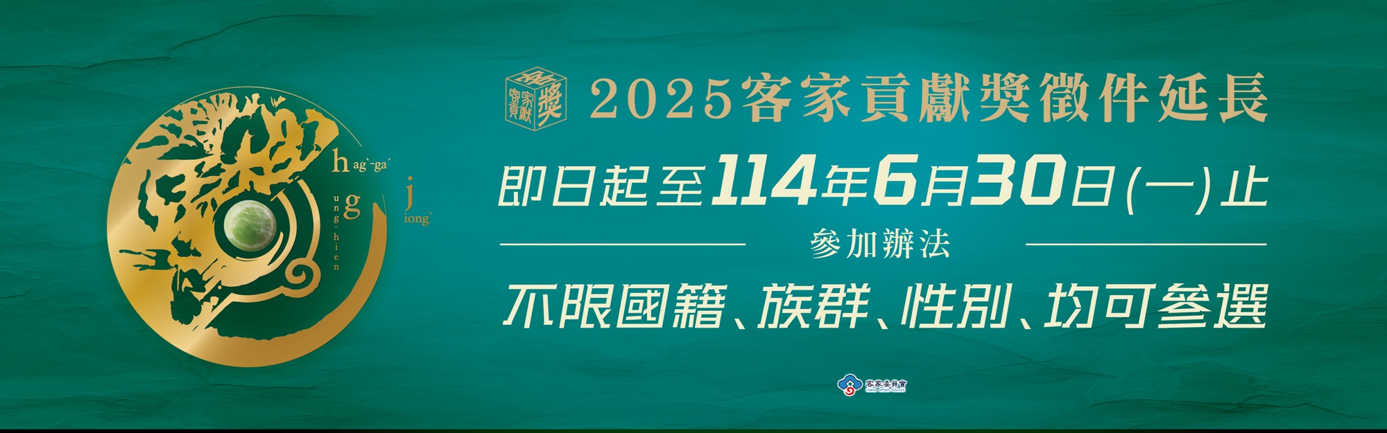 竭誠歡迎各界踴躍推薦於語言、文史、文學、學術研究、藝術、文創產業、文化傳承、公共事務、海外推廣等客家事務之個人或團體參選,受理報名至114年6月30日(星期一)止,並以郵戳為憑,請欲參選者儘早備齊資料報名,逾時不予受理,承蒙您,恁仔細。