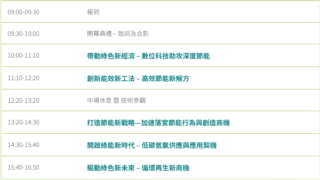 - 協辦單位:三三會青年企業家委員會、中華民國全國中小企業總會、台灣太陽光電產業協會、台灣化學產業協會、台灣科學園區科學工業同業公會、台灣流體傳動工業同業公會、台灣淨零排放協會、台灣區電機電子工業同業公會、台灣氫能與燃料電池夥伴聯盟、台灣氫能與燃料電池學會、台灣雲端物聯網產業協會、台灣智慧自動化與機器人協會、台灣智慧航空城產業聯盟、台灣智慧淨零建築產業聯盟、台灣電力與能源工程協會、台灣綠建築發展協會、台灣綠電應用協會、台灣熱管理協會、台灣鋼鐵工業同業公會、台灣顯示器材料與元件產業協會、全國商業總會、低碳產業永續發展聯盟 (按筆畫排序)