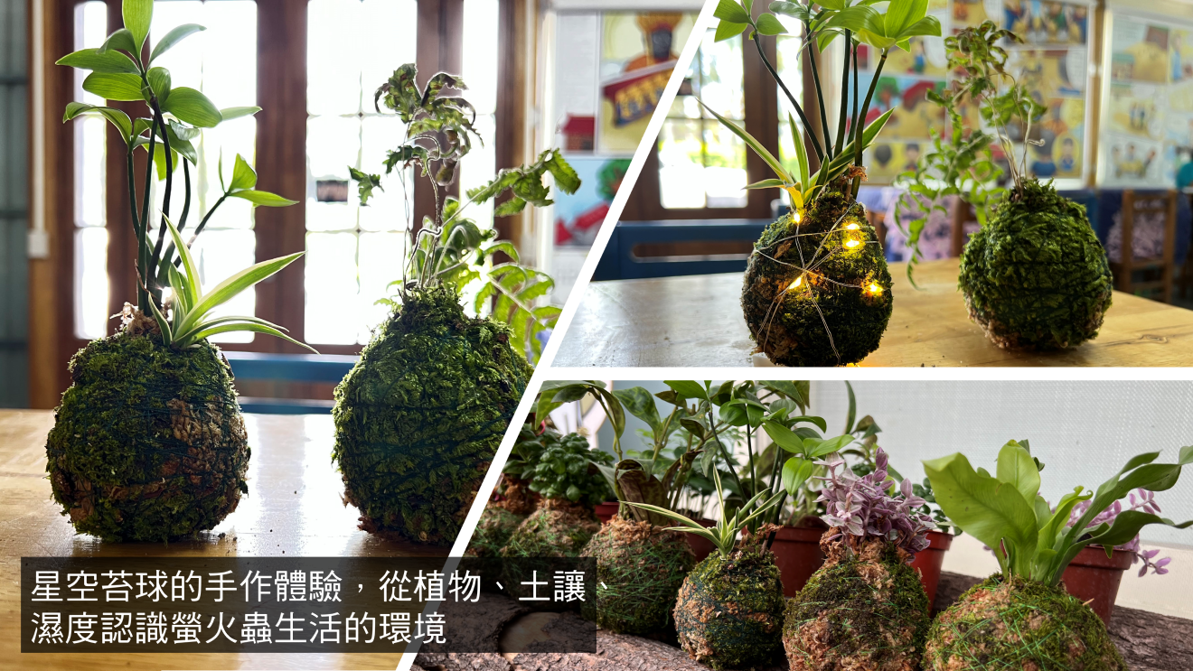 14 : 10 | 15 : 30 | 星空苔球 手作DIY | 植物、土壤、濕度, 是 螢火蟲 生存的生態條件。 利用 苔球手作 的體驗活動,認識螢火蟲的生態吧! |