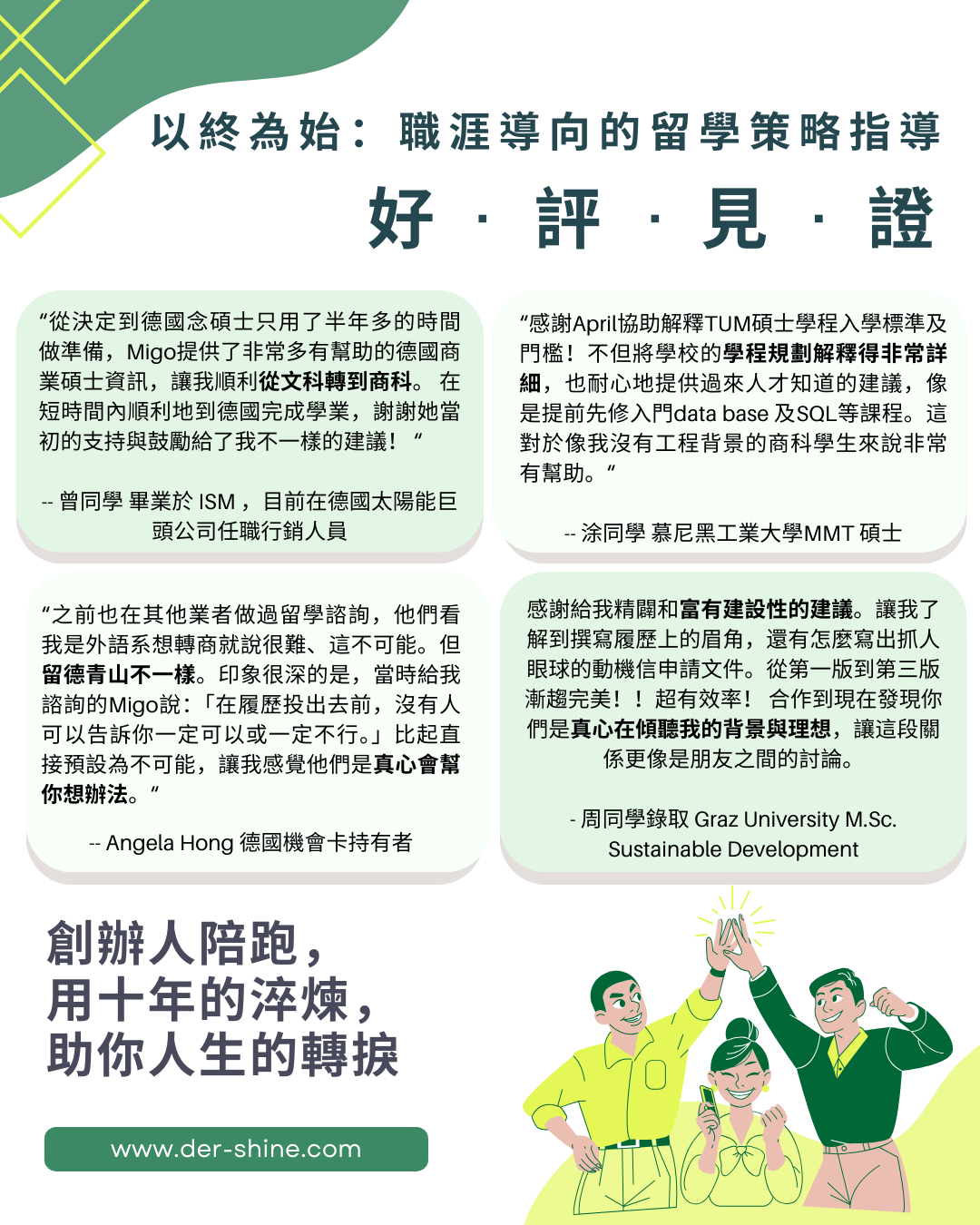 這一切都從德國留學開始,身為過來人,Migo跟April 能夠提早幫你在學路上避坑,求學目的「以終為始,職涯導向」,改變人生軌跡就從此刻開始!