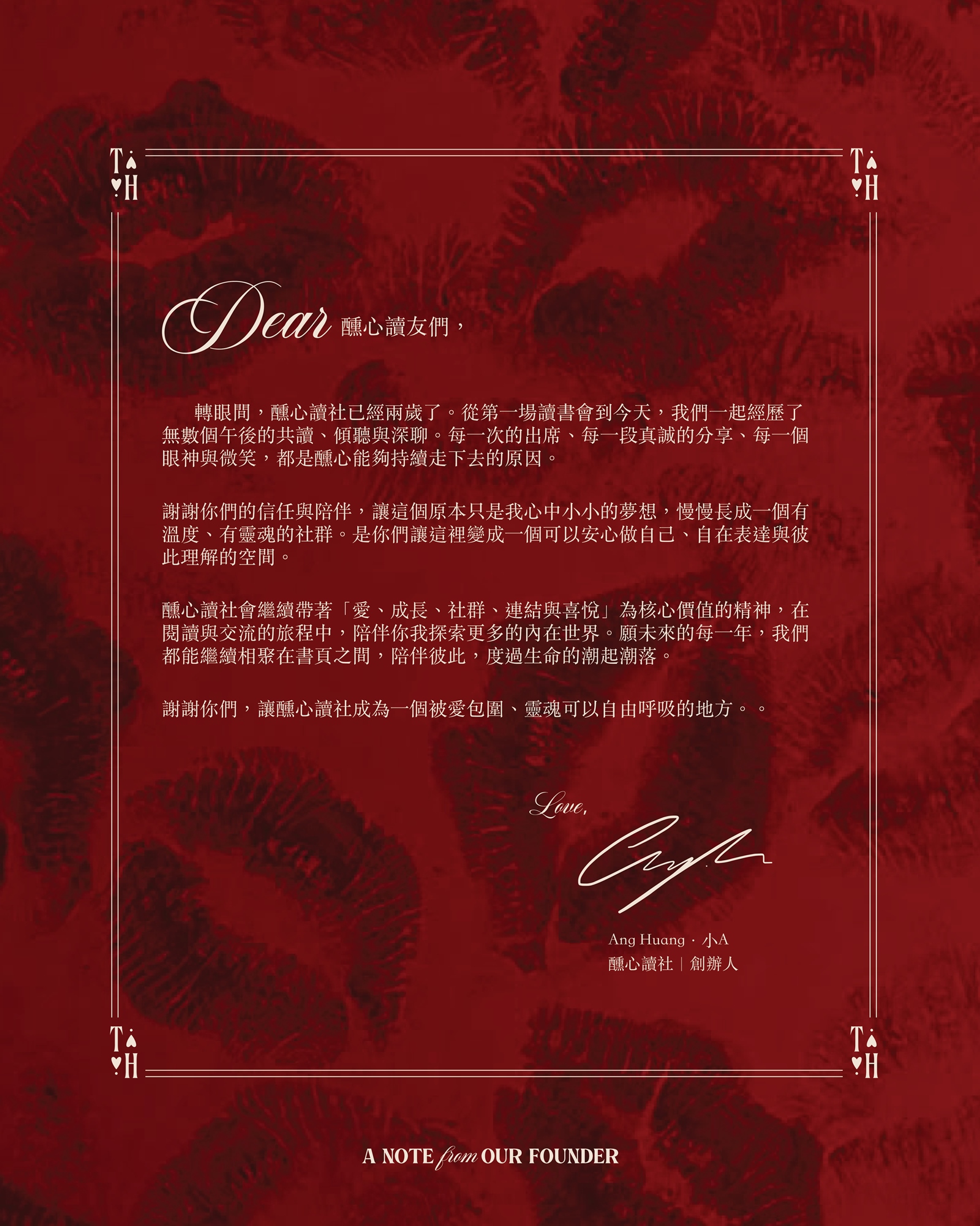 「我總是說,『醺心讀社是我寫給這世界的情書。』所以在二週年的這個月份,我想選一本我認為最浪漫的書,也代表了醺心對於自由的初心——自由表達、自由做最真實的自己、自由交流… 希望你們也能在這本書裡,找到屬於自己的浪漫與自由。」