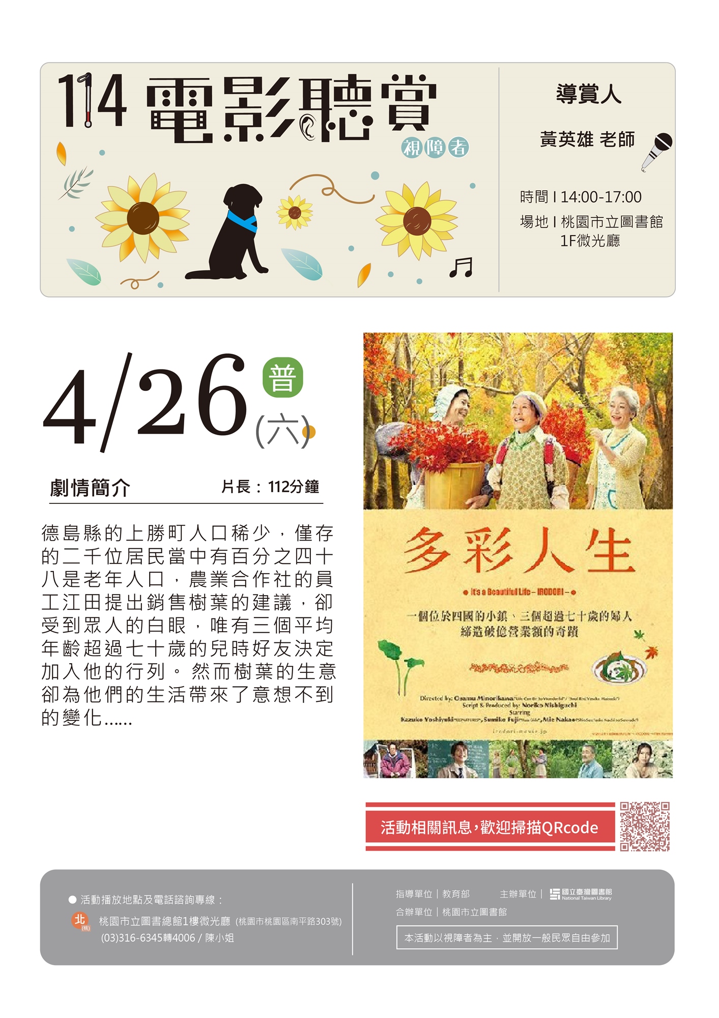 | 北區(桃) | 4月26日 (六)14:00-17:00 | 多彩人生 | ★普遍級:一般觀眾皆可觀賞 | 桃園市立圖書館總館1樓微光廳 |