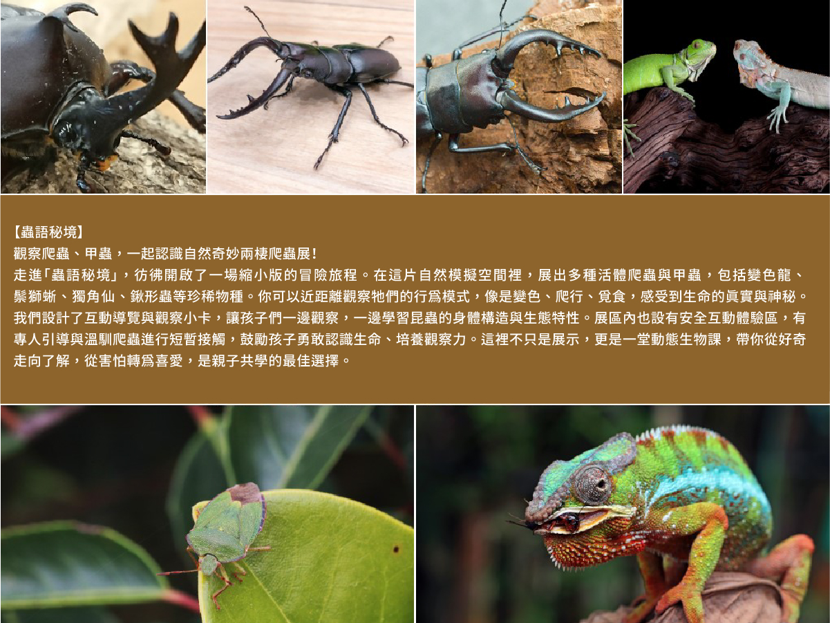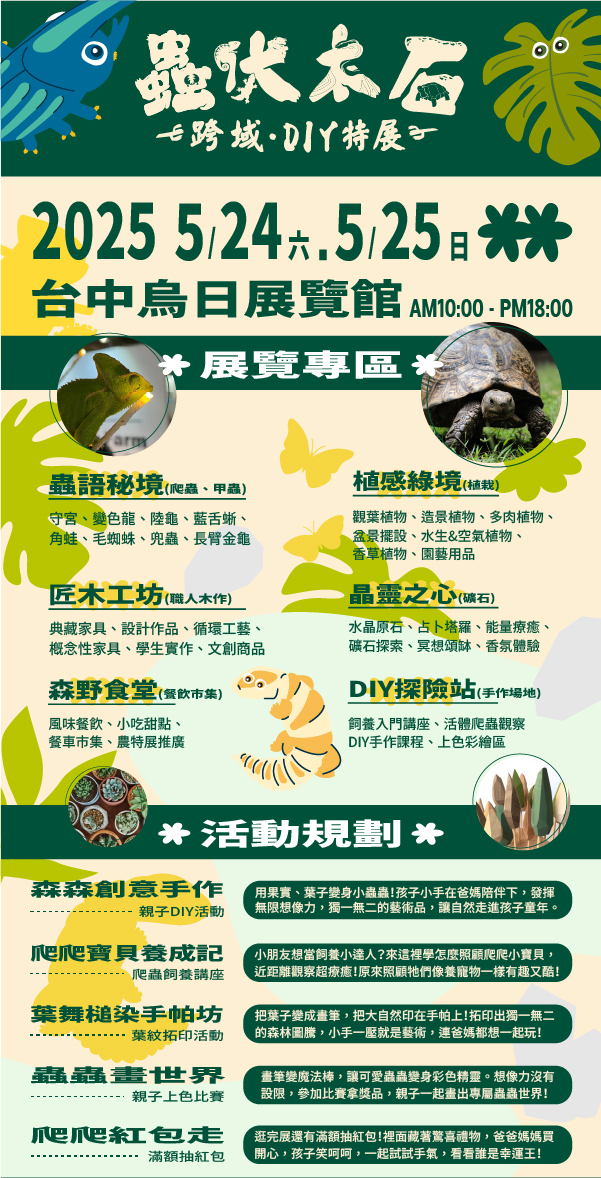 「蟲伏木石 跨域DIY特展」 以自然與創意為主題,匯集多樣展區與體驗活動,帶領您走進一場跨領域的藝術饗宴。展區涵蓋爬蟲探索、植栽綠藝、木創工藝及水晶能量,讓您親身感受大自然的奧秘與美麗。每個展區都精心設計,帶您一探昆蟲、植物、木藝與水晶的獨特魅力。
