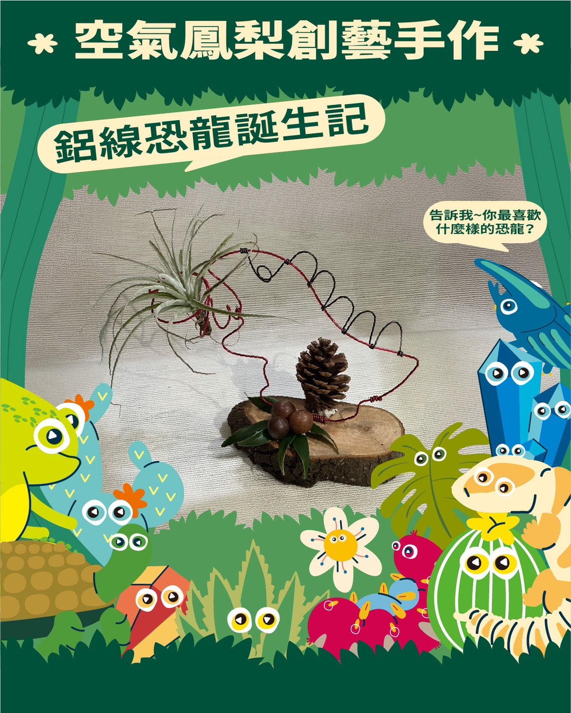 黑紅鋁線交織,捲動出栩栩如生的小恐龍!搭配空氣鳳梨、松果、短尾葉石櫟與大葉南洋杉,在木片上打造出一方迷你侏羅紀世界。親手創作,讓自然與創意共舞,帶回家一隻專屬你的森林小恐龍!🌿✨