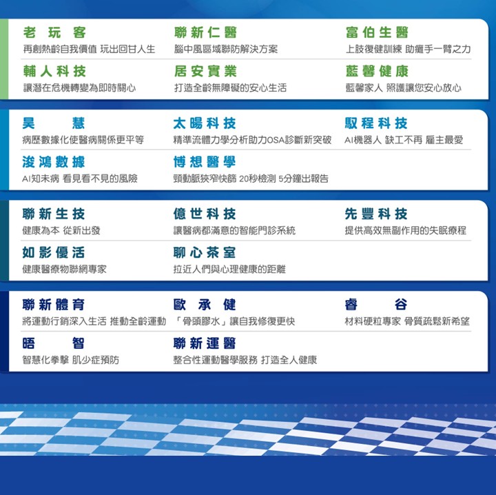 - 醫療新創:聯新仁醫、睿谷、歐承健 、太暘科技 、博想醫學科技專注於先進的醫療技術與臨床應用,提升醫療質量。