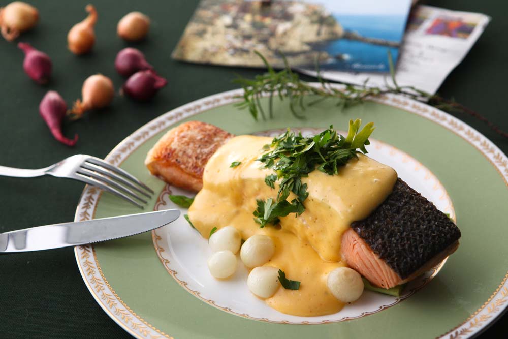 【第二道:香煎鮭魚佐檸檬荷蘭醬】