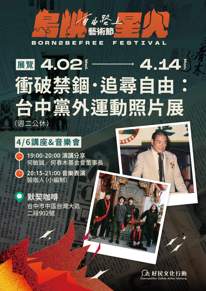 【衝破禁錮.追尋自由:台中黨外運動照片展】將以何春木的經歷為起點,帶領大家回顧台中的黨外運動歷史。透過影像紀錄那個風起雲湧的時代,讓我們重新認識這段爭取民主自由的歷程,看前人如何不畏強權衝破禁錮,勇敢追求民主自由,也理解黨外運動對台灣社會發展的影響。