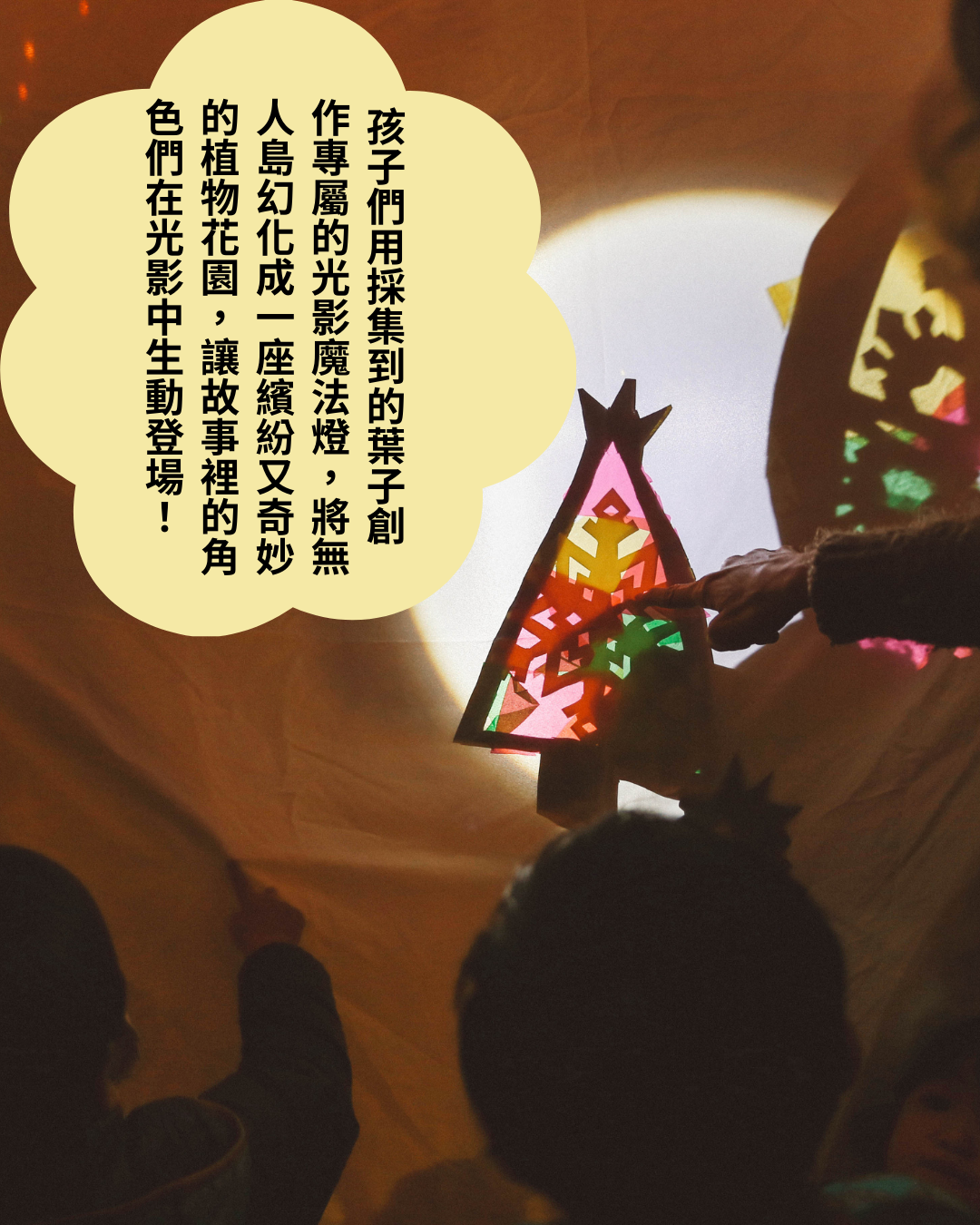 在探索完植物島後,孩子們將挑選自己喜歡的葉子,創作專屬的光影魔法燈,投射到帳篷內的各個角落,將小塊與朋友們的無人島幻化成一座奇妙又繽紛的植物花園,讓故事裡的角色們在光影中生動登場!