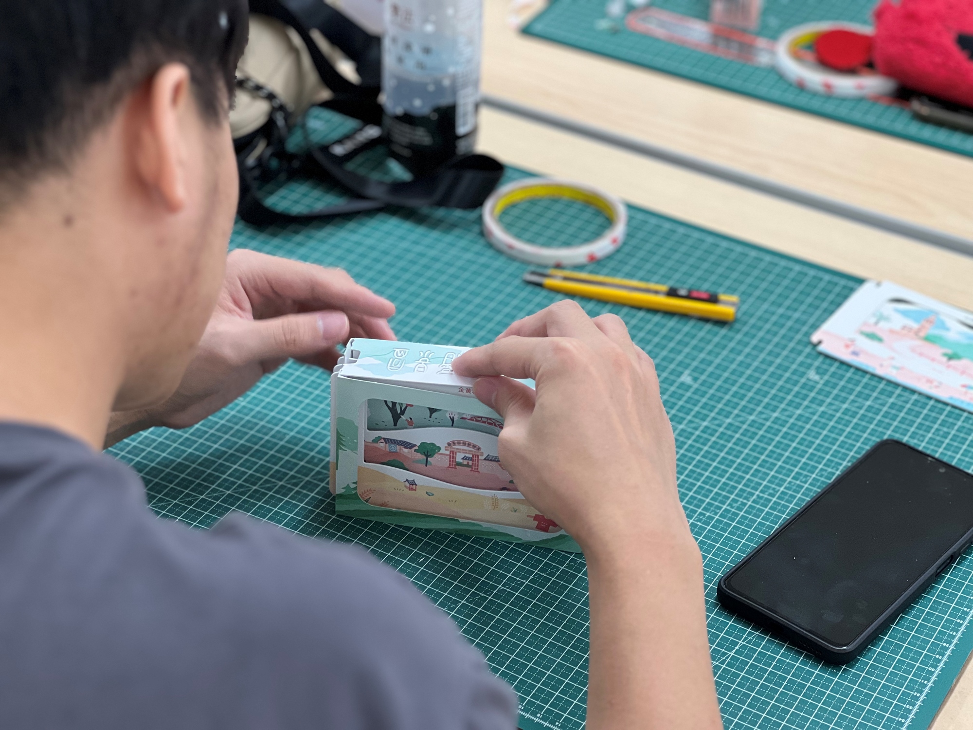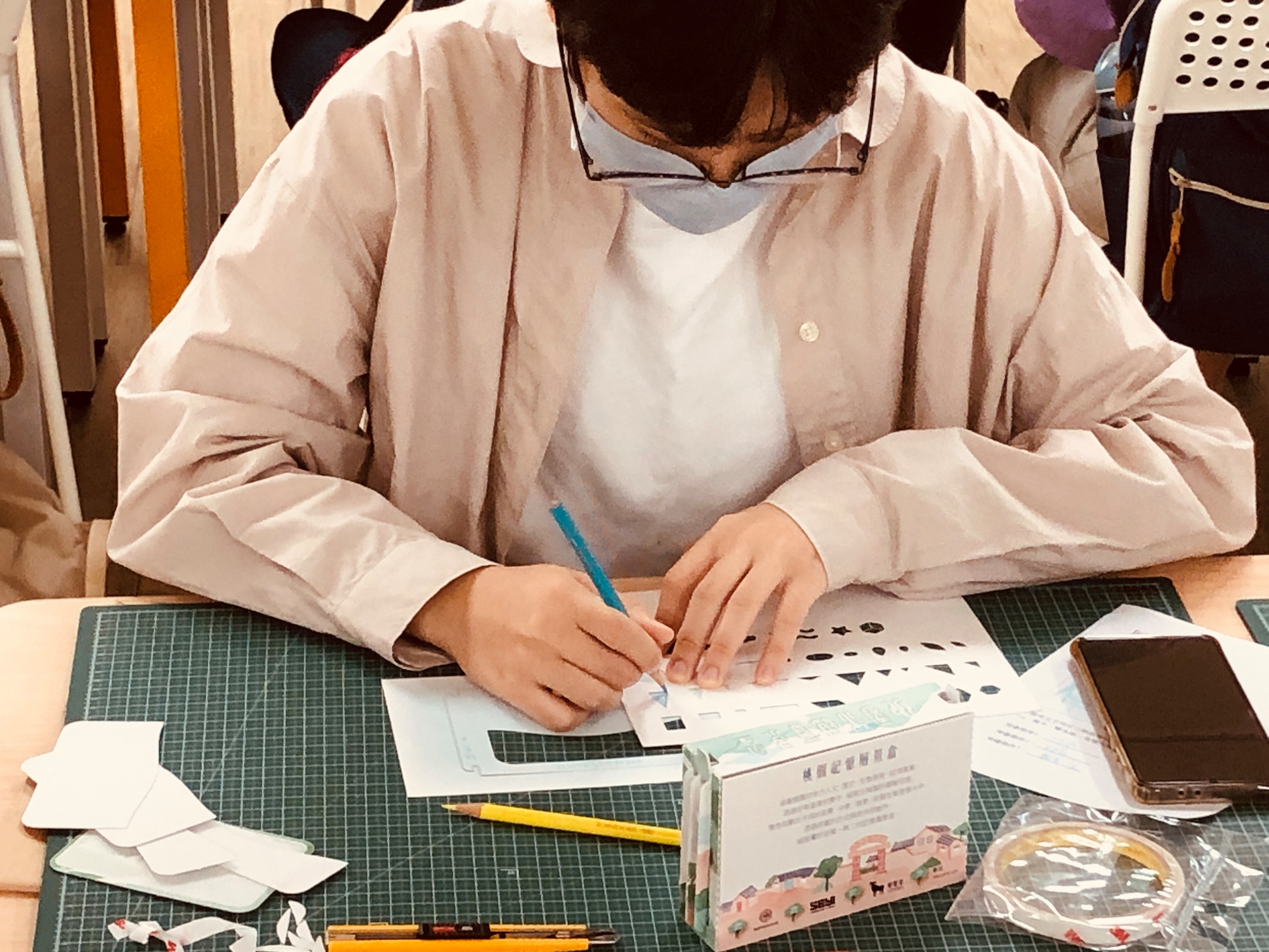 ⬆︎引導學員創作出記憶中的城市景色,並利用模板繪製技巧完成獨一無二的紙藝層景作品。