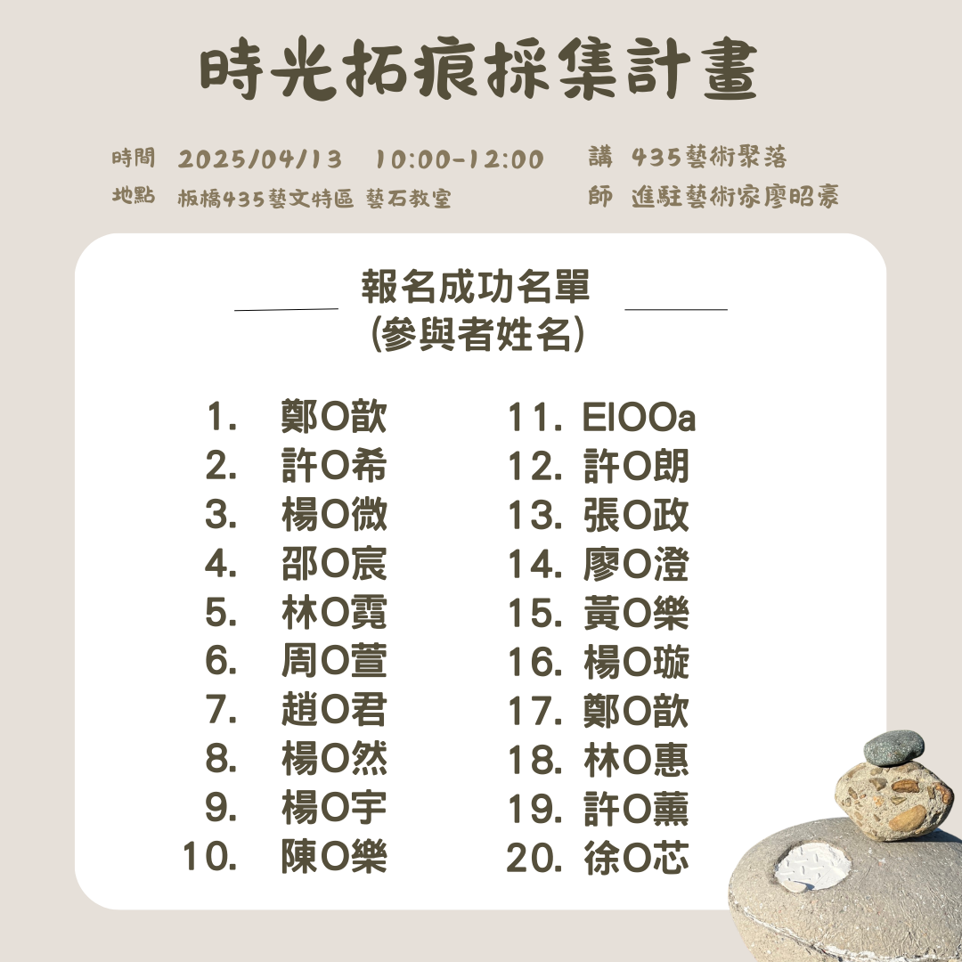 o 報名成功名單將於活動前公告於活動頁面及板橋 435 藝文特區 Facebook 粉專相關貼文留言處。